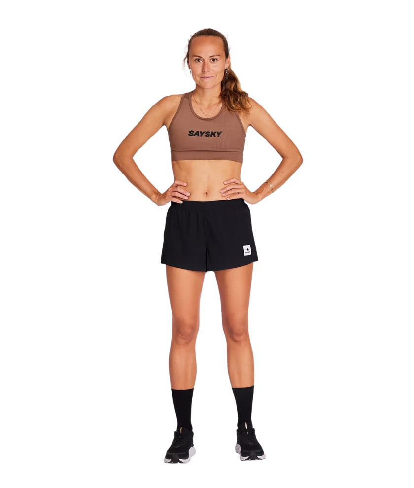 SAYSKY sports bras were developed in close collaboration with the cool ladies of the SAYSKY athlete team. A medium support sports bra with removable padding, brown body and SAYSKY logo printed on the front. Made from ultra-soft and lightweight recycled combat fabric, the back is made of black mesh material that is highly stretchy and breathable. Can be used for running, training, and everyday wear.