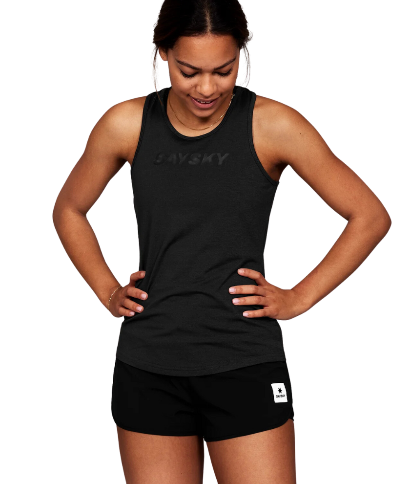 The SAYSKY Logo Pace Top is a running top for women in black made from recycled polyester. It has a clean, sleek design and comes with a SAYSKY logo on the front and a woven SAYSKY label on the back. The fit is regular, with a super soft fabric and great wicking abilities.