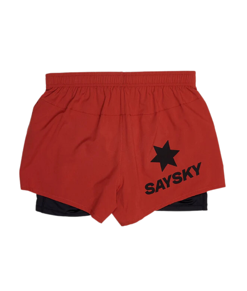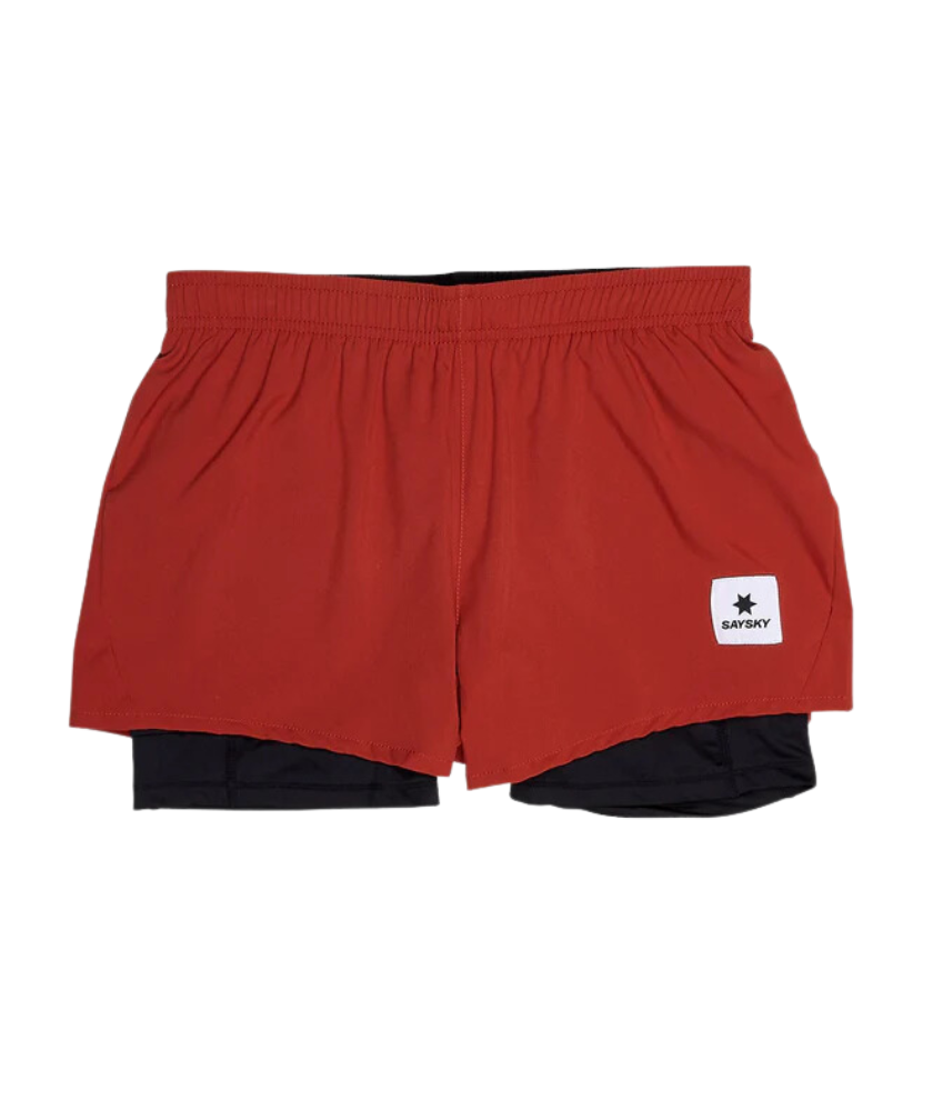 SAYSKY's Women's Pace 2-in-1 Shorts 3 inches are a popular style in the SAYSKY lineup. The outer color is red, and the inner color comes with long black shorts. There is a white logo patch on the front, and a black SAYSKY logo is printed on the back side. Regular fit design makes it perfect for running, trail running, and at the gym.