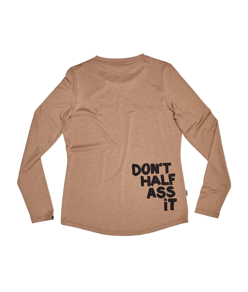 SAYSKY's Women's Statement Pace Long Sleeve is a women's running long sleeve T-shirt. It has a brown body made of recycled polyester and has a black SAYSKY label on the front chest. The statement logo " Don't Half Ass It " is printed on the back hem . The regular fit design is designed to provide both comfort and high performance.