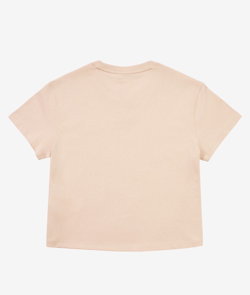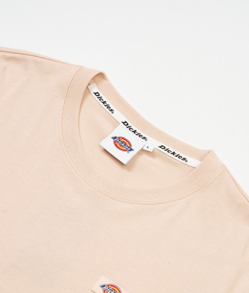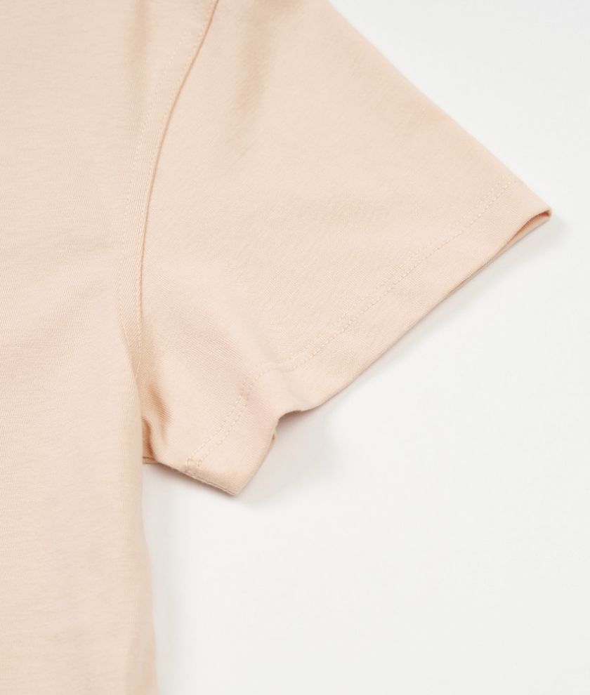 A T-shirt with a brand logo patch on the chest. The wide width allows you to wear it loosely, and it subtly blurs any body lines you may be concerned about.
