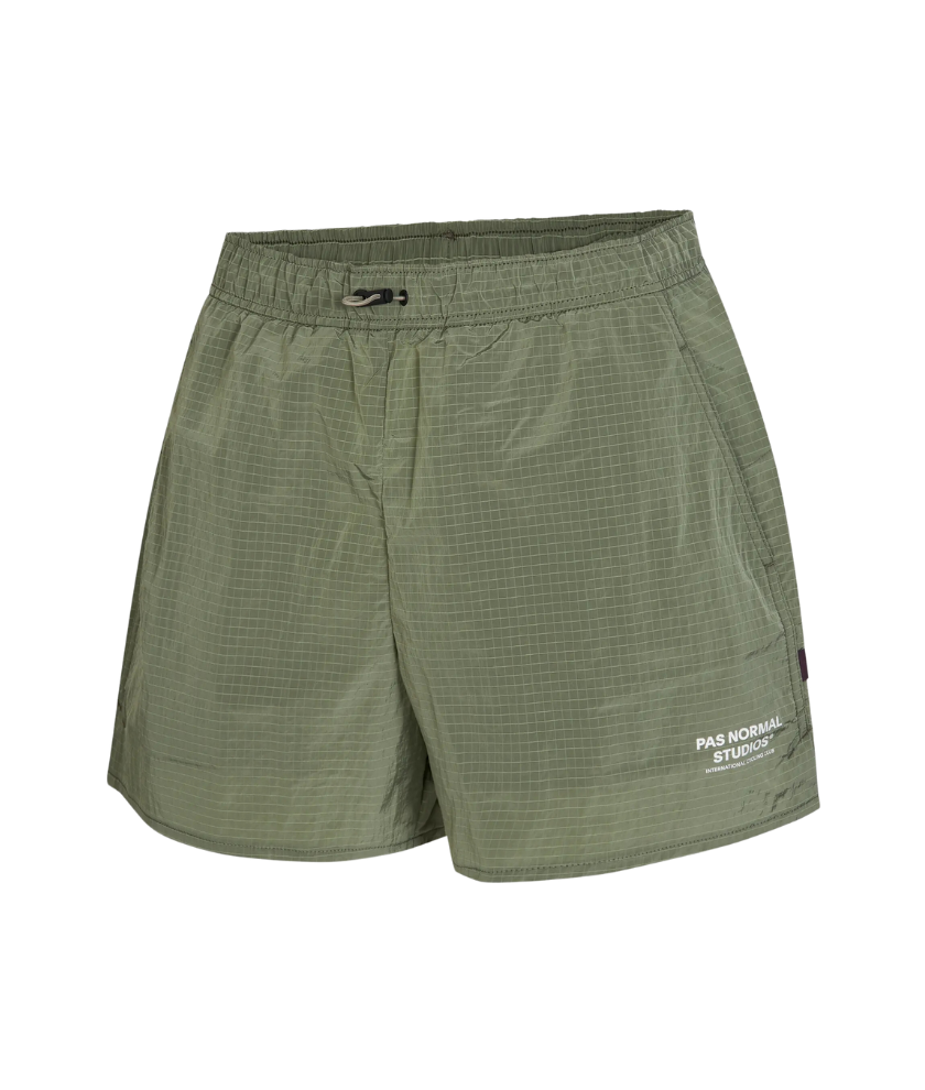 Light and minimalistic shorts with a drawstring waist and simple pockets. Packable, durable and versatile. These shorts are made with a 100% Polyamide Ripstop woven fabric. With a high resistance to tearing and ripping. The combination of a quick-drying Ripstop fabric and lightweight material makes these shorts ideal for bike-packing adventures or off-bike moments. The shorts have a shiny look and feel and come in both Black and Army Green colourways.
