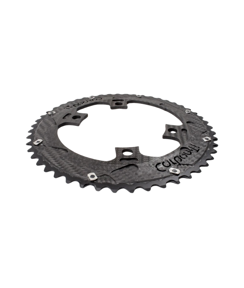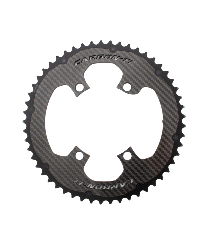 Carbon-Ti chainring X-CarboRing 50 x 110 DA9100 (4 arms), crown in Al7075-T6 aluminum alloy, structural carbon fiber with polished 3K finish and Grade 5 Titanium pin. 50 teeth external gear and bolt round (BCD ) 110 mm 4 arms. Compatibility with Shimano Dura Ace FC-9100, Ultegra FC-8000 or SRM Origin 9100 cranks and Shimano, SRAM and Campagnolo 10-11 speed groupsets.